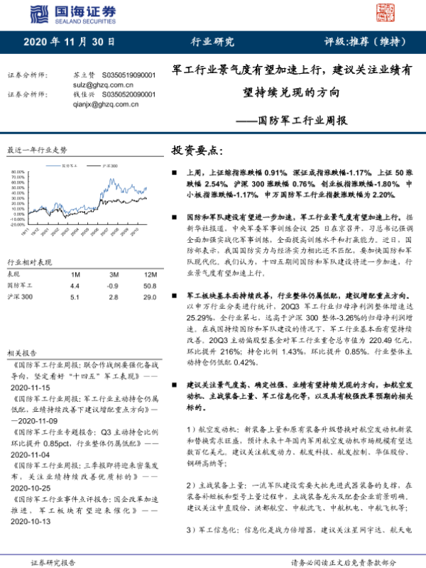 【国海证券】【20201130】国防军工行业周报:军工行业景气度有望加速上行,建议关注业绩有望持续兑现的方向-12页 行业研究