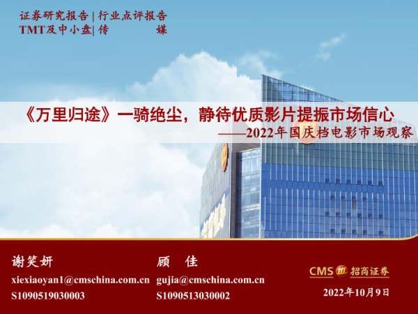 【海通证券】【20221009】2022年国庆档电影市场观察:《万里归途》一骑绝尘,静待优质影片提振市场信心-12页 行业研究