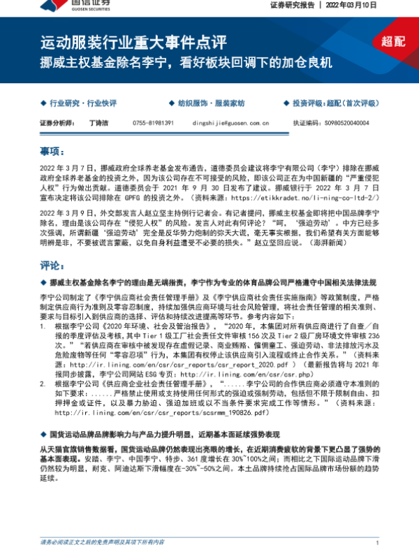 【国信证券】【20220310】运动服装行业重大事件点评:挪威主权基金除名李宁,看好板块回调下的加仓良机-9页 行业研究