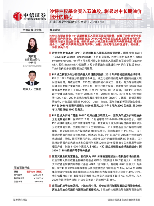 【中信证券】【20200410】石油石化行业国际油价点评:沙特主权基金买入石油股,彰显对中长期油价回升的信心-8页 行业研究