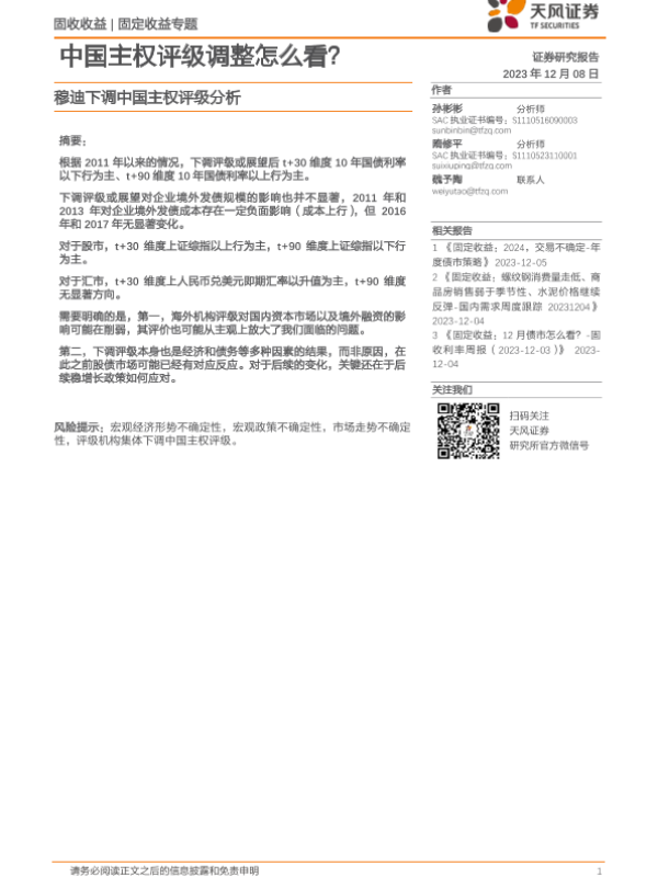 【天风证券】【20231208】穆迪下调中国主权评级分析:中国主权评级调整怎么看?-12页 行业研究