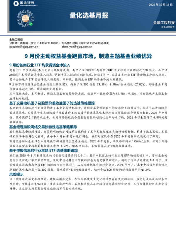 【国金证券】【202509】量化选基月报:9月份主动权益基金跑赢市场,制造主题基金业绩优异-11页 证券期货研究报告