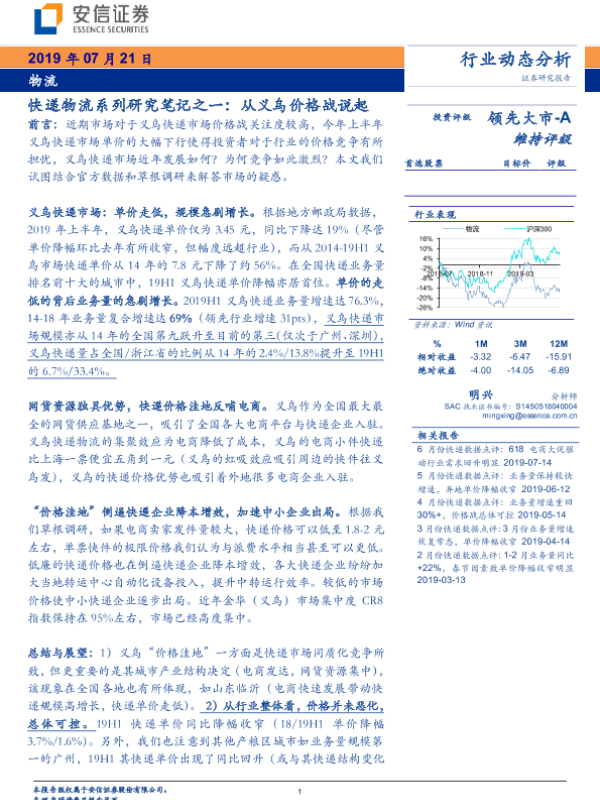 【安信证券】【20190721】快递物流系列研究笔记之一:从义乌价格战说起-9页 行业研究