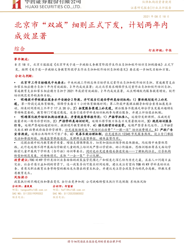 【华西证券】【20210818】北京市“双减”细则正式下发,计划两年内成效显著-3页 证券期货研究报告