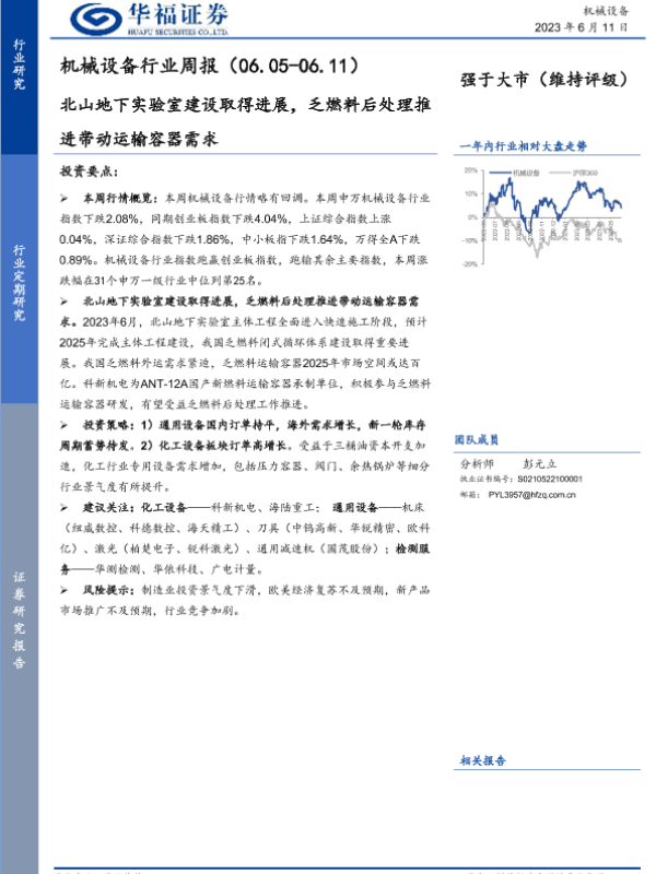 【华福证券】【20230611】20230611-华福证券-机械设备行业周报:北山地下实验室建设取得进展,乏燃料后处理推进带动运输容器需求-11页 行业研究