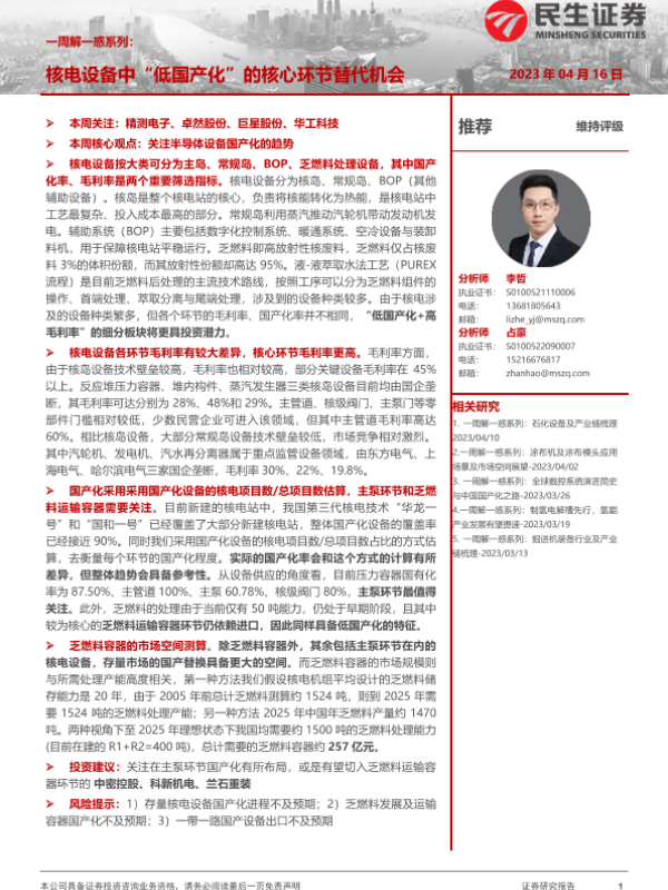 【民生证券】【20230416】机械一周解一惑系列:核电设备中“低国产化”的核心环节替代机会-21页 行业研究
