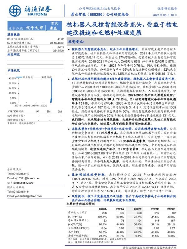 【海通证券】【20220518】景业智能-688290.SH-公司研究报告:核机器人及核智能设备龙头,受益于核电建设提速和乏燃料处理发展-21页 行业研究