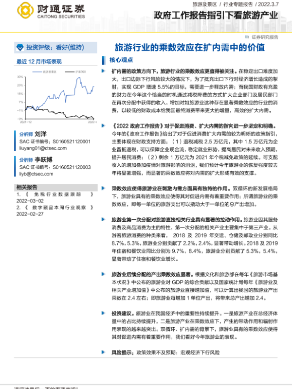 【财通证券】【20220307】旅游及景区行业专题报告:政府工作报告指引下看旅游产业-旅游行业的乘数效应在扩内需中的价值-8页 行业研究