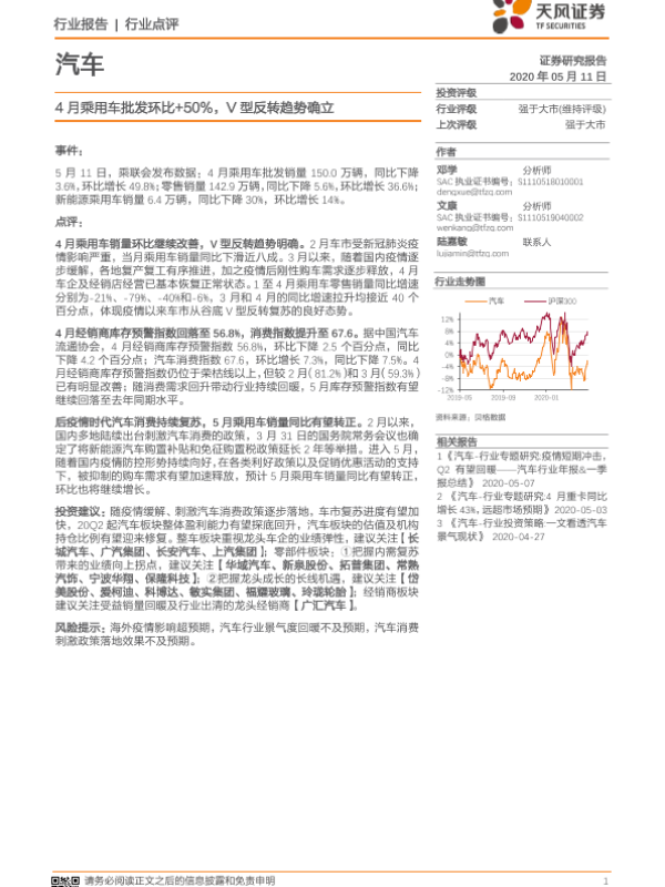 【天风证券】【20200511】20200512-天风证券-汽车行业点评:4月乘用车批发环比+50%,V型反转趋势确立-11页 行业研究