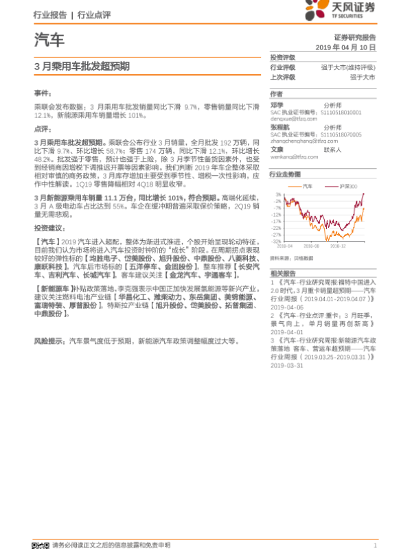 【天风证券】【20190410】20190410-天风证券-汽车行业点评:3月乘用车批发超预期-10页 行业研究