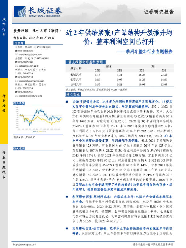 【长城证券】【20230129】乘用车整车行业专题报告:近2年供给紧张+产品结构升级推升均价,整车利润空间已打开-31页 行业研究