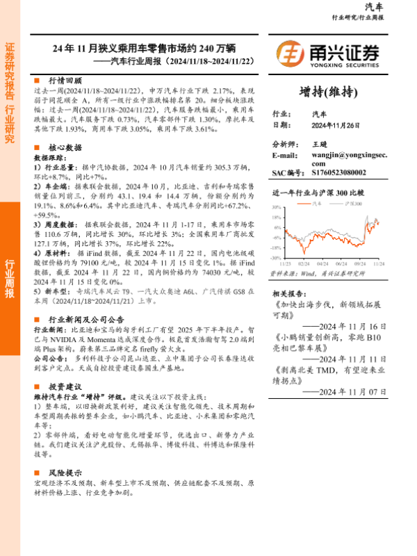【甬兴证券】【20241126】24年11月狭义乘用车零售市场约240万辆-12页 行业研究