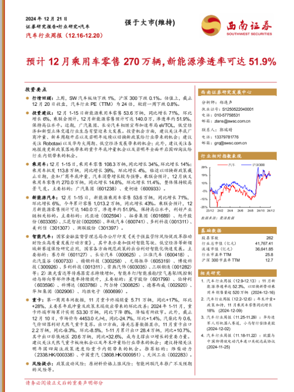 【西南证券】【20250210】2025年02月10日更新-【西南证券】汽车行业周报:预计12月乘用车零售270万辆,新能源渗透率可达51.9%-20页 行业研究