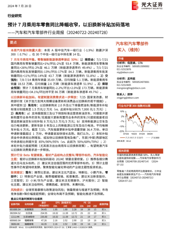 【光大证券】【20240728】汽车和汽车零部件行业周报:预计7月乘用车零售同比降幅收窄,以旧换新补贴加码落地-37页 行业研究