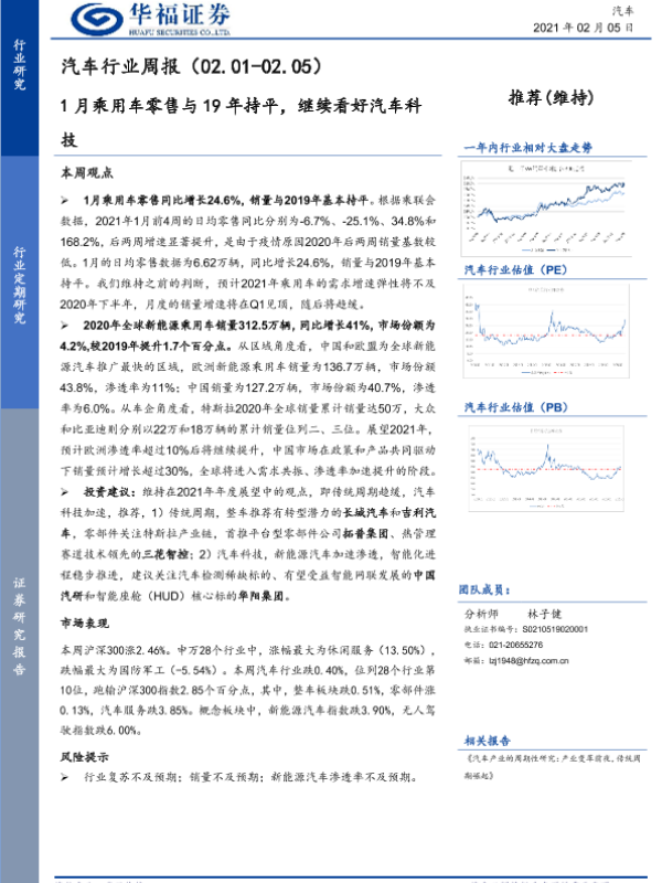 【华福证券】【20210205】20210205-华福证券-汽车行业周报:1月乘用车零售与19年持平,继续看好汽车科技-7页 行业研究