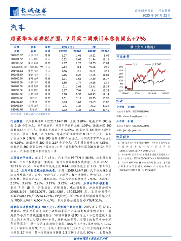 【长城证券】【20250722】超豪华车消费税扩围,7月第二周乘用车零售同比+7%-11页 证券期货研究报告
