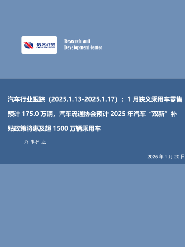 【信达证券】【20250120】20250120-信达证券-汽车行业跟踪:1月狭义乘用车零售预计175.0万辆,汽车流通协会预计2025年汽车“双新”补贴政策将惠及超1500万辆乘用车-13页 行业研究