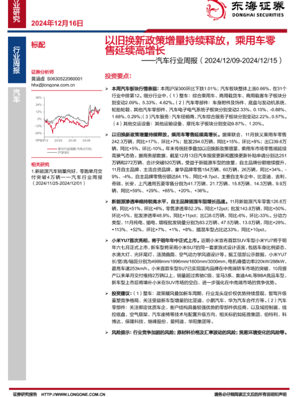 【东海证券】【20241216】20241216-东海证券-汽车行业周报:以旧换新政策增量持续释放,乘用车零售延续高增长-14页 行业研究