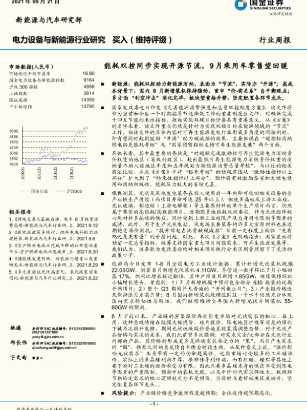 【国金证券】【20210921】电力设备与新能源行业研究:能耗双控同步实现开源节流,9月乘用车零售望回暖-5页 行业研究