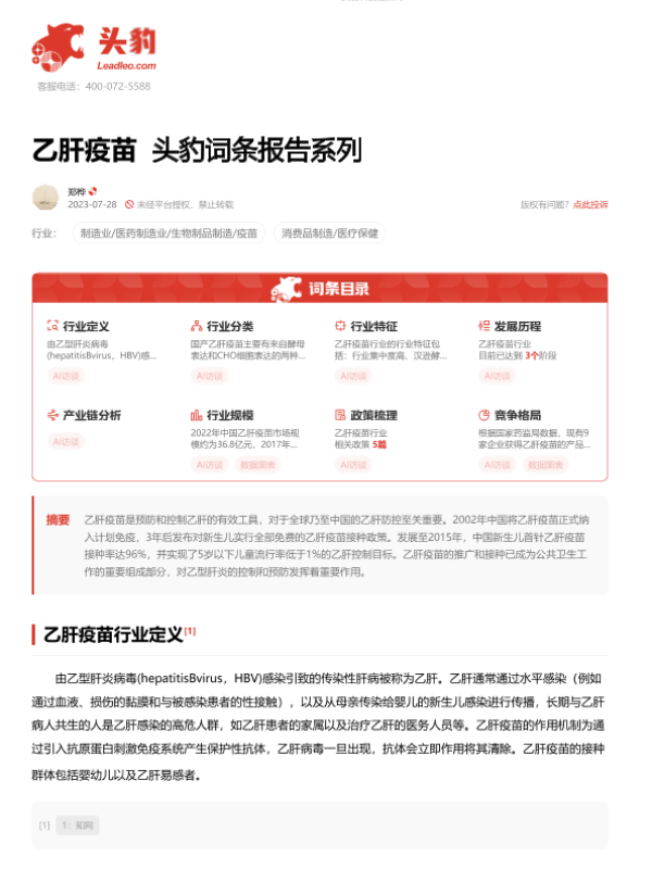 【头豹研究院】【20230728】乙肝疫苗 头豹词条报告系列-18页 行业研究