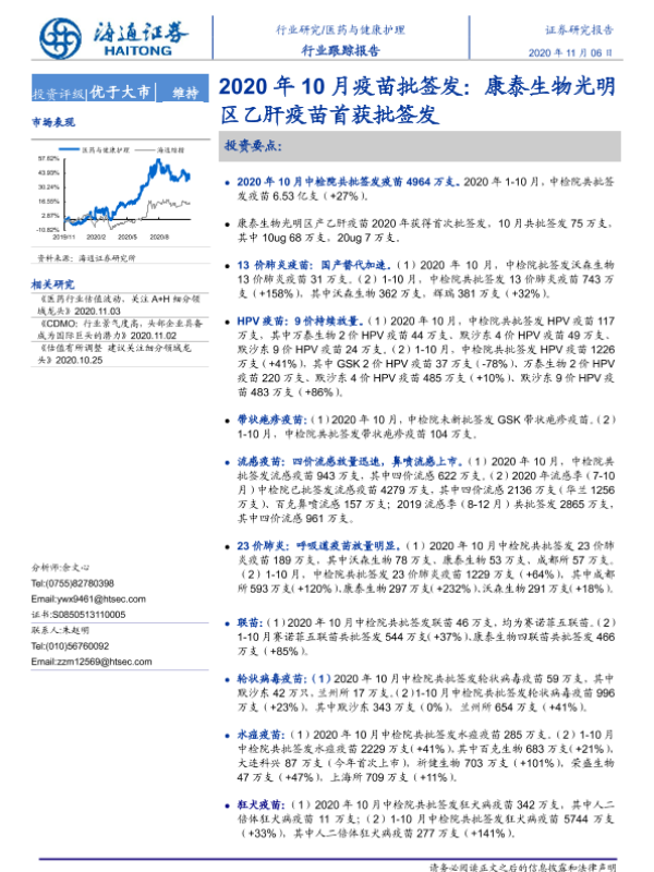 【海通证券】【20201106】2020年10月疫苗批签发:康泰生物光明区乙肝疫苗首获批签发-5页 行业研究