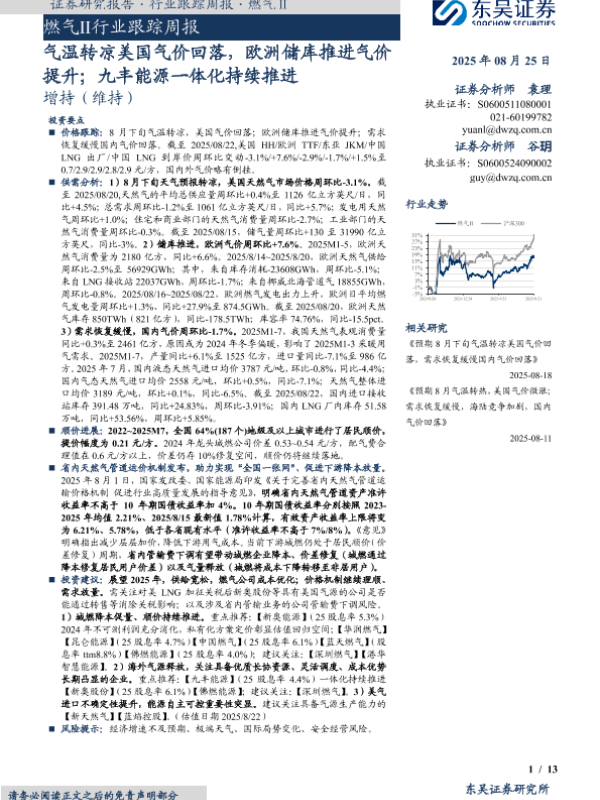 【东吴证券】【20250825】九丰能源-气温转凉美国气价回落,欧洲储库推进气价提升;九丰能源一体化持续推进-13页 证券期货研究报告