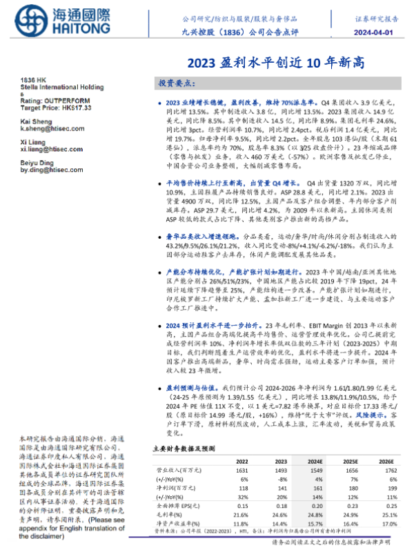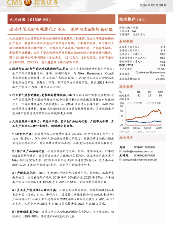 【海通证券】【20240728】九兴控股(01836.HK)运动休闲及时尚鞋履代工龙头,深耕研发&持续高分红-22页 行业研究