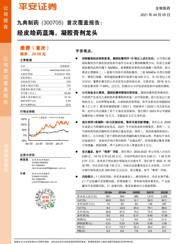 【平安证券】【20210405】九典制药(300705)首次覆盖报告:经皮给药蓝海,凝胶膏剂龙头-35页 行业研究