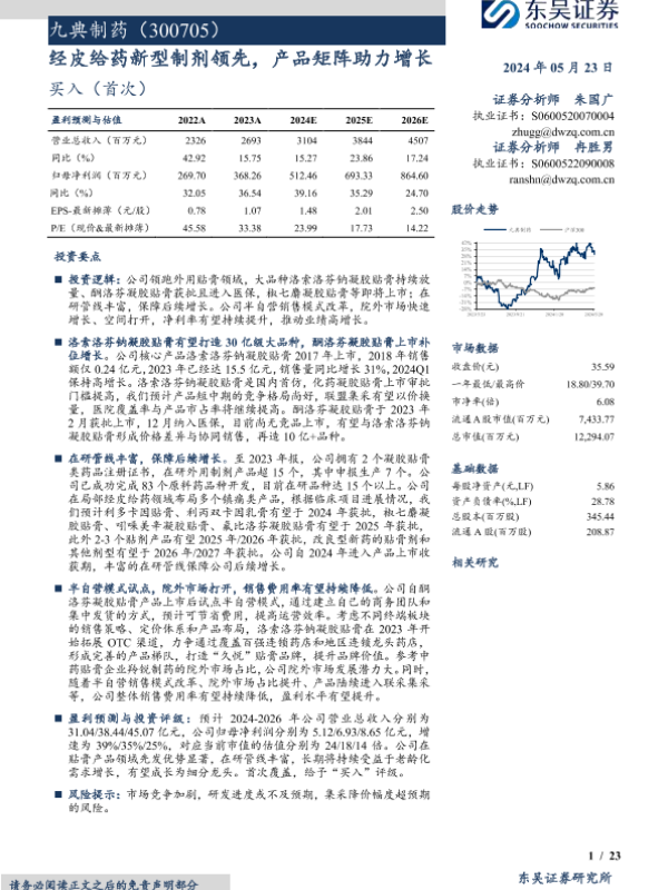 【东吴证券】【20240523】九典制药(300705)经皮给药新型制剂领先,产品矩阵助力增长-23页 行业研究