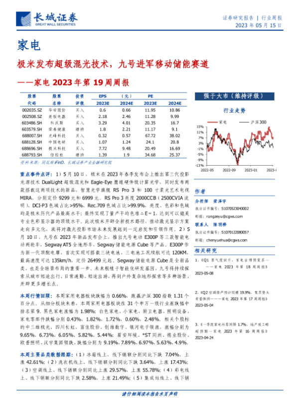 【长城证券】【20230515】家电2023年第19周周报:极米发布超级混光技术,九号进军移动储能赛道-28页 行业研究