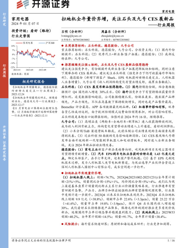【开源证券】【20240107】20240107-开源证券-家用电器行业周报:扫地机全年量价齐增,关注石头及九号CES展新品-16页 行业研究