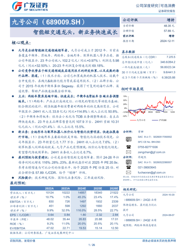 【广发证券】【20241211】九号公司(689009.SH)智能短交通龙头,新业务快速成长-26页 行业研究