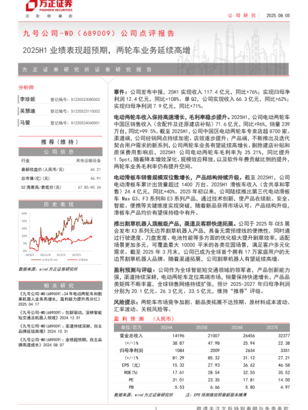 【方正证券】【20250805】九号公司-689009-公司点评报告:2025H1业绩表现超预期,两轮车业务延续高增-3页 公司研究