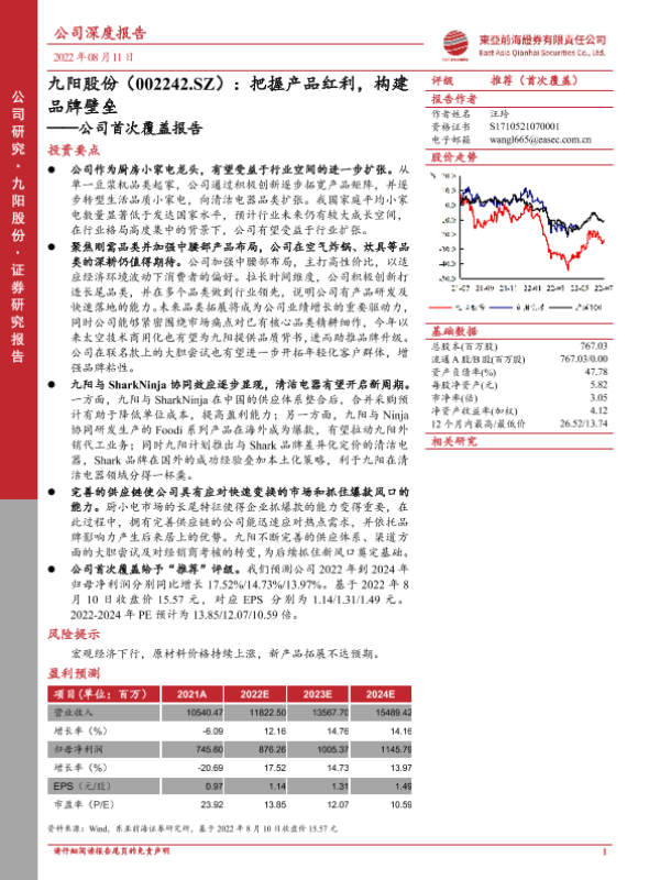 【东亚前海证券】【20220811】九阳股份(002242.SZ):把握产品红利,构建品牌壁垒——公司首次覆盖报告-25页 行业研究