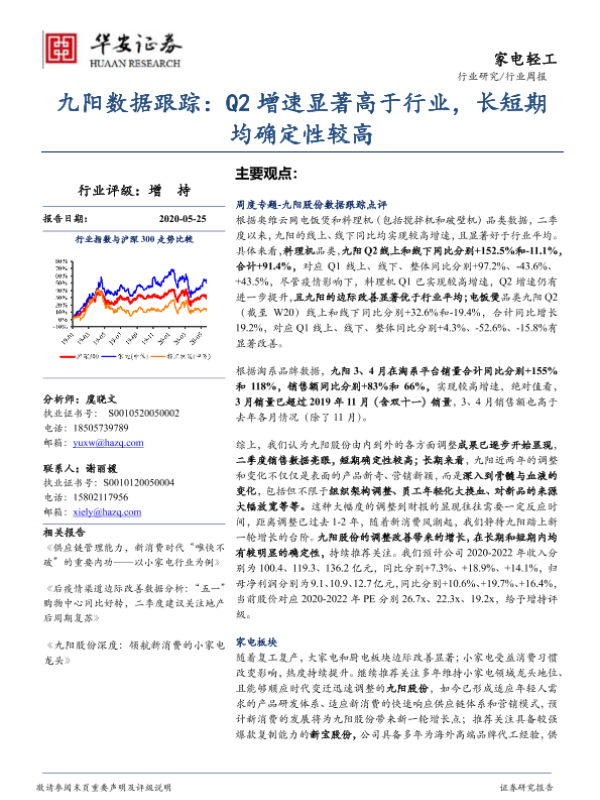 【华安证券】【20200525】20200525-华安证券-九阳数据跟踪:Q2增速显著高于行业,长短期均确定性较高-14页 行业研究