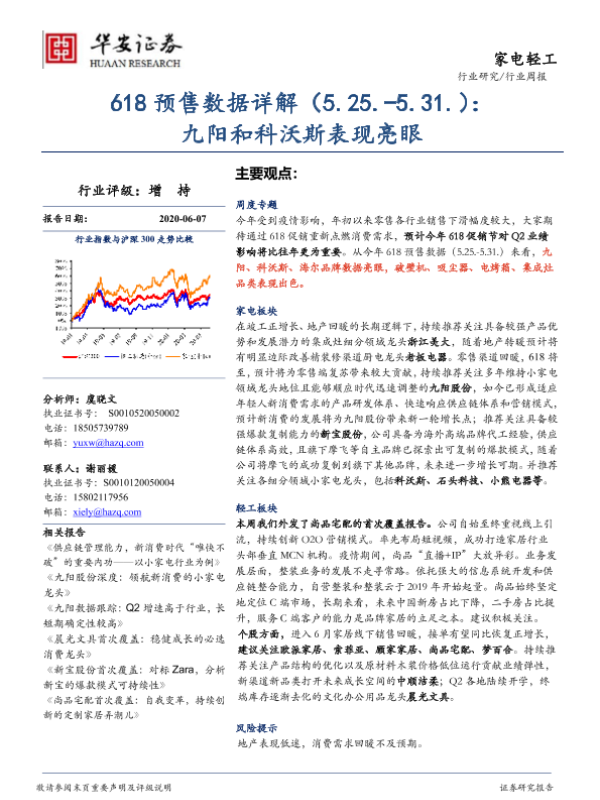【华安证券】【20200607】20200607-华安证券-家电轻工行业周报:618预售数据详解:九阳和科沃斯表现亮眼-16页 行业研究