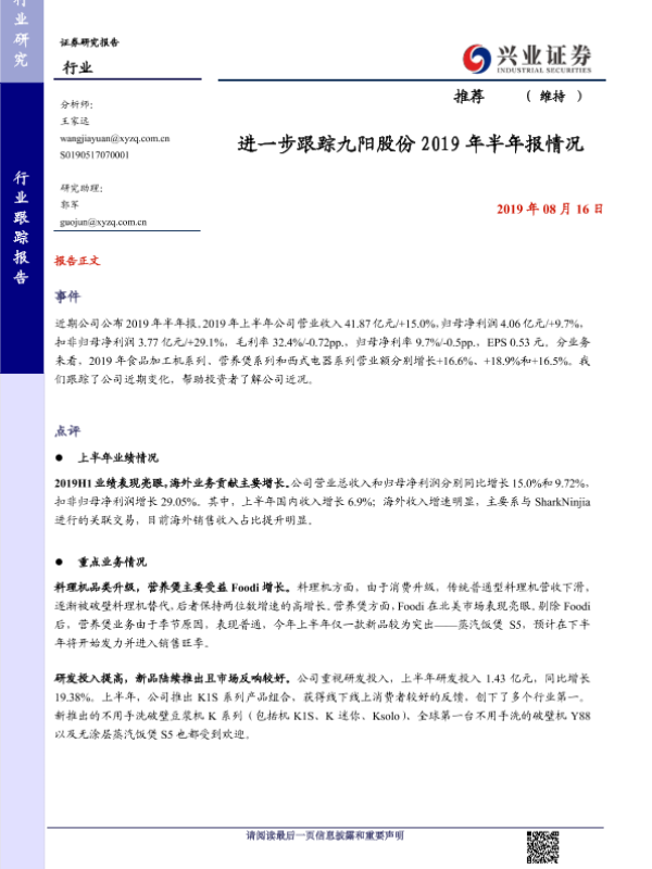 【兴业证券】【20190816】进一步跟踪九阳股份2019年半年报情况-4页 行业研究