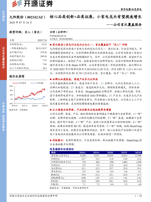 【开源证券】【20200724】九阳股份-公司首次覆盖报告:核心品类创新+品类拓展,小家电龙头有望提速增长-25页 证券期货研究报告