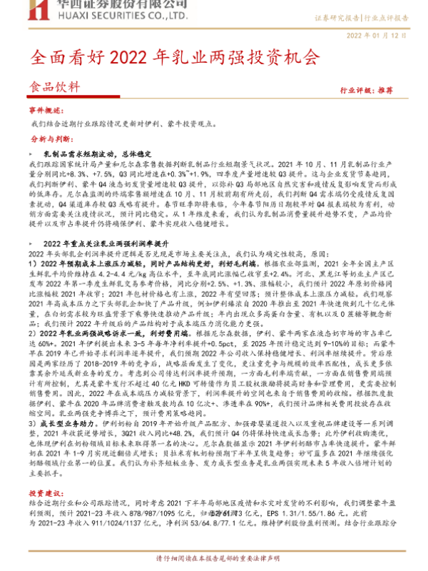 【华西证券】【20220112】食品饮料行业店评:全面看好2022年乳业两强投资机会-4页 行业研究