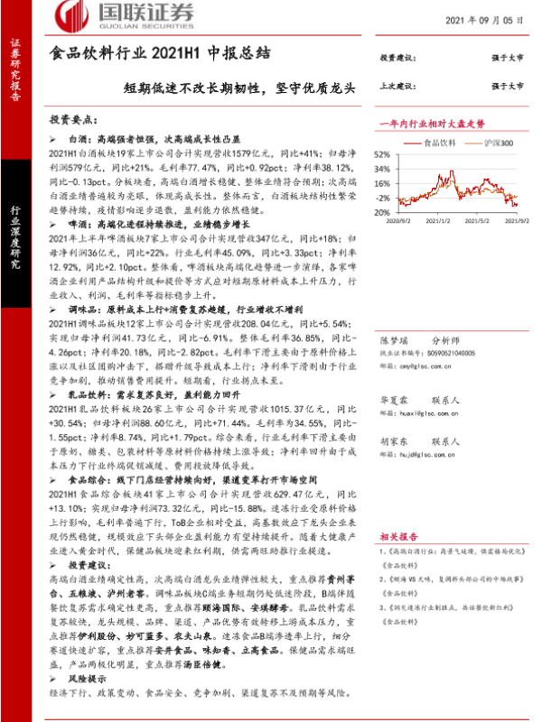 【国联证券】【20210905】食品饮料行业2021H1中报总结:短期低迷不改长期韧性,坚守优质龙头-37页 行业研究