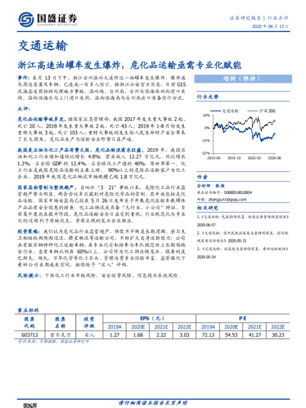 【国盛证券】【20200613】浙江高速油罐车发生爆炸,危化品运输亟需专业化赋能-2页 行业研究