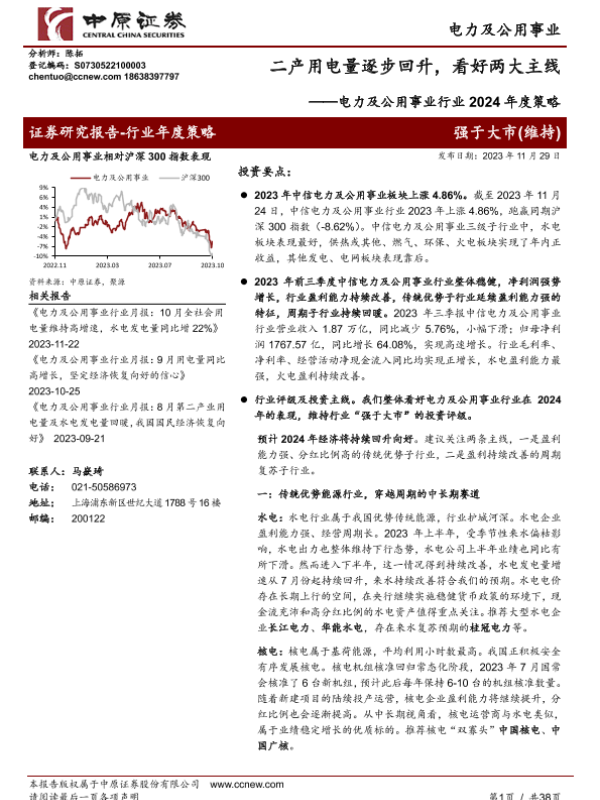 【中原证券】【20231129】电力及公用事业行业2024年度策略-二产用电量逐步回升-看好两大主线-38页 行业研究