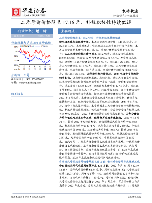 【华安证券】【20221231】20221231-华安证券-农林牧渔行业周报:二元母猪价格降至17.16元,补栏积极性持续低迷-40页 行业研究