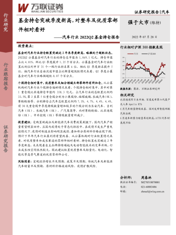 【万联证券】【20220728】2022Q2基金持仓报告:基金持仓突破季度新高,对整车及优质零部件相对看好-6页 行业研究