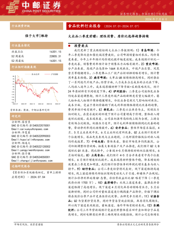 【中邮证券】【20240708】20240708-中邮证券-食品饮料行业报告:大众品二季度前瞻:理性消费、质价比选择趋势持续-21页 行业研究