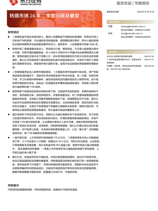 【东方证券】【20240707】转债市场24年二季度回顾及展望-13页 行业研究