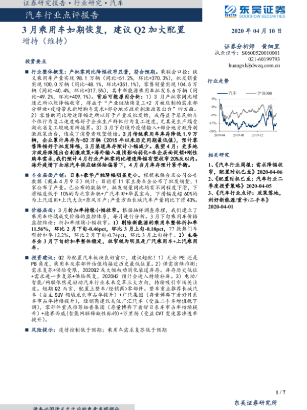 【东吴证券】【20200410】20200410-东吴证券-汽车行业点评报告:3月乘用车如期恢复,建议Q2加大配置-7页 行业研究