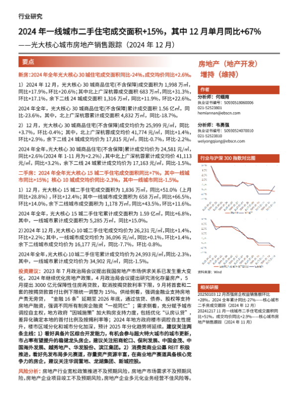 【光大证券】【202412】地产销售跟踪(2024年12月):2024年一线城市二手住宅成交面积+15%,其中12月单月同比+67%-10页 行业研究