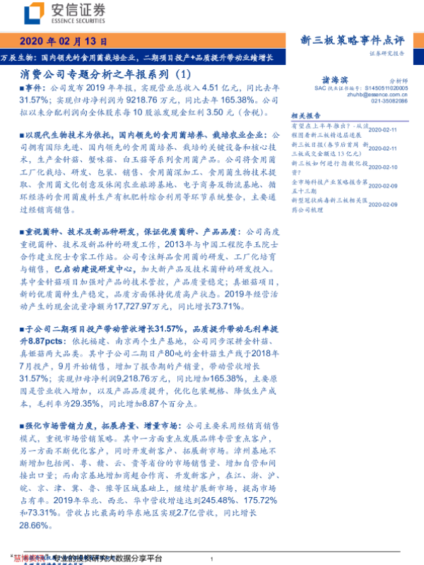【安信证券】【20200213】消费公司专题分析之年报系列(1):国内领先的食用菌栽培企业,二期项目投产+品质提升带动业绩增长-4页 行业研究