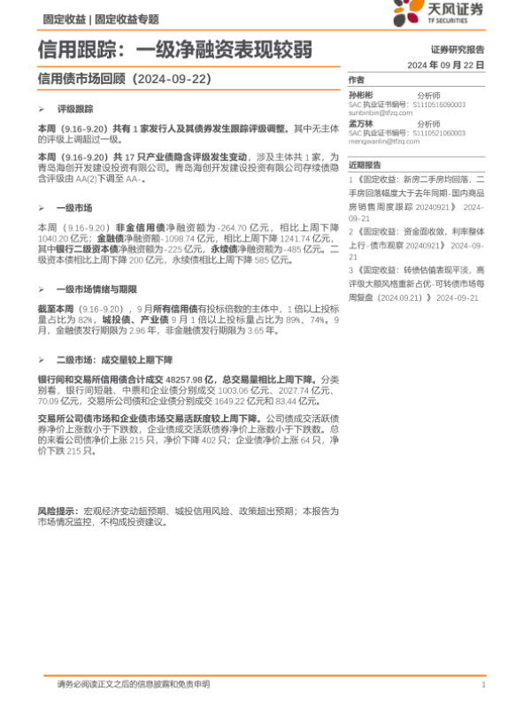 【天风证券】【20240922】信用债市场回顾:信用跟踪,一级净融资表现较弱-19页 行业研究